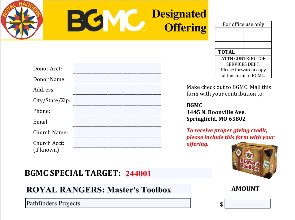 Money given to BGMC (Boys and Girls Missions Challenge) and Royal Rangers Master’s Toolbox can now be designated to Pathfinder Missions Projects. A designated offering form with special target number 244001 must be printed and mailed with your contribution to ensure it is applied to Pathfinders Projects and that your church receives world missions giving credit.